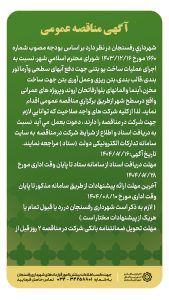 آگهي مناقصه عمومی شهرداري رفسنجان نسبت به اجرای عملیات ساخت یو بتنی جهت دفع آبهای سطحی وآرماتور بندی،قالب بندی،بتن ریزی وعمل آوری بتن جهت ساخت مخزن،آبنما والمانهای بلوارفاتحان اروند وپروژه های عمرانی