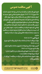 شهرداري رفسنجان در نظر دارد بر اساس بودجه مصوب شماره۱۶۶۰ مورخ ۱۶/۱۲/۱۴۰۳ شورای محترم اسلامي شهر، نسبت به اجرای عملیات انتقال بتن بادستگاه میکسر جهت دیوار حائل رودخانه شور صادق آباد،مجموعه گردشگری تفریحی شهربازی وپروژه های عمرانی درسطح شهرازطريق برگزاري مناقصه عمومی اقدام نمايد. لذا از کلیه شرکت های واجد صلاحیت که توانايي لازم جهت شرکت در مناقصه را دارند ، دعوت بعمل مي آيد نسبت به دریافت اسناد و اطلاع از شرايط شركت در مناقصه به سایت سامانه تدارکات الکترونیکی دولت (ستاد ) مراجعه نمايند.
